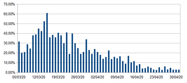 Il grafico sull’andamento dei contagi giornalieri nelle Marche nel periodo 4 marzo – 1° maggio 2020.