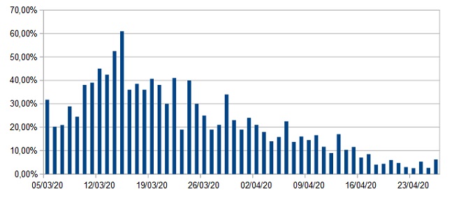 Il grafico sull’andamento dei contagi giornalieri nelle Marche nel periodo 4 marzo – 26 aprile 2020.