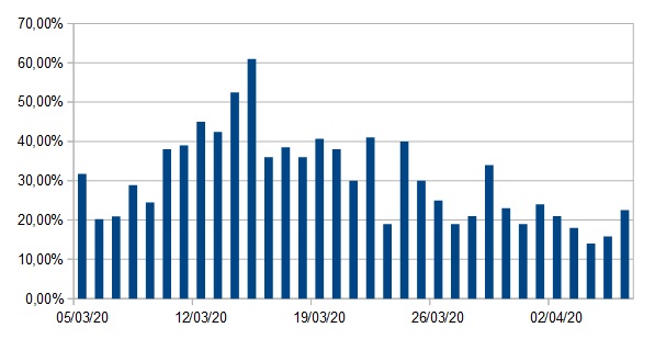 Il grafico sull’andamento dei contagi giornalieri nelle Marche nel periodo 4 marzo – 6 aprile 2020