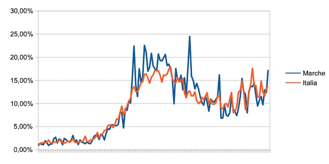 Il grafico seguente illustra l’andamento della percentuale giornaliera di nuovi casi positivi rispetto al corrispondente numero di tamponi (diagnostici +quelli di controllo) effettuati a livello nazionale e nella regione Marche nel periodo 1 settembre 2020 – 11 gennaio 2021.