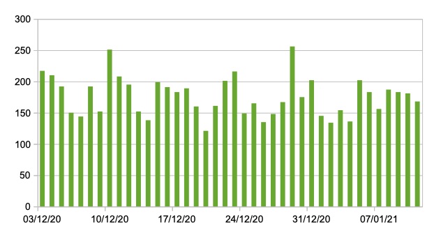 Il grafico seguente mostra i dati giornalieri ,a livello nazionale, relativi ai nuovi ingressi in terapia intensiva 3 dicembre 2020 -11 gennaio 2021