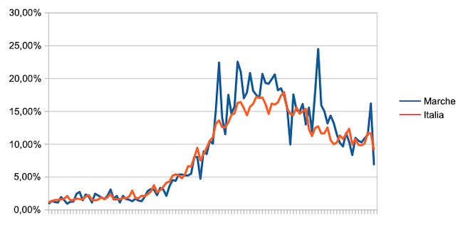 Il grafico seguente mostra l’andamento della percentuale giornaliera di nuovi casi positivi rispetto al corrispondente numero di tamponi (diagnostici +quelli di controllo) effettuati a livello nazionale e nella regione Marche nel periodo 1 settembre – 15 dicembre 2020.