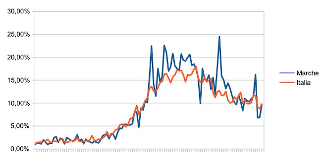 Il grafico seguente mostra l’andamento della percentuale giornaliera di nuovi casi positivi rispetto al corrispondente numero di tamponi (diagnostici +quelli di controllo) effettuati a livello nazionale e nella regione Marche nel periodo 1 settembre – 17 dicembre 2020.