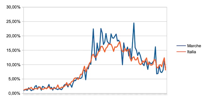 Il grafico seguente mostra l’andamento della percentuale giornaliera di nuovi casi positivi rispetto al corrispondente numero di tamponi (diagnostici +quelli di controllo) effettuati a livello nazionale e nella regione Marche nel periodo 1 settembre – 22 dicembre 2020.