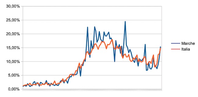 Il grafico seguente mostra l’andamento della percentuale giornaliera di nuovi casi positivi rispetto al corrispondente numero di tamponi (diagnostici +quelli di controllo) effettuati a livello nazionale e nella regione Marche nel periodo 1 settembre – 27 dicembre 2020.