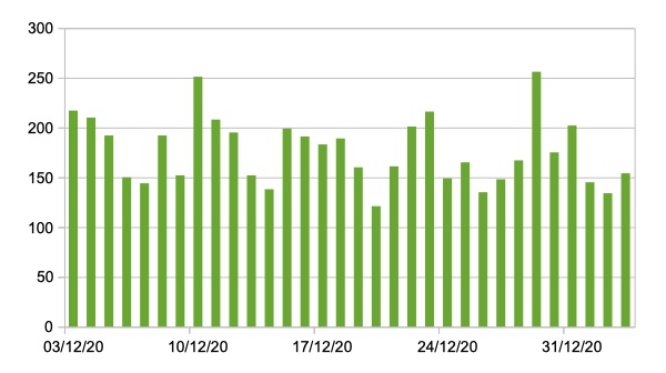 Il grafico seguente mostra i dati giornalieri ,a livello nazionale, relativi ai nuovi ingressi in terapia intensiva dal 3 dicembre 2020 al 3 gennaio 2021