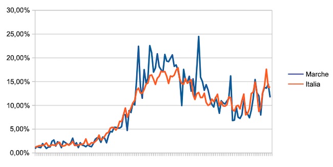 Il grafico seguente illustra l’andamento della percentuale giornaliera di nuovi casi positivi rispetto al corrispondente numero di tamponi (diagnostici +quelli di controllo) effettuati a livello nazionale e nella regione Marche nel periodo 1 settembre 2020 – 4 gennaio 2021.