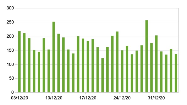 Il grafico seguente mostra i dati giornalieri ,a livello nazionale, relativi ai nuovi ingressi in terapia intensiva dal 3 dicembre 2020 al 4 gennaio 2021