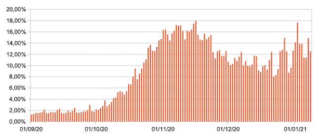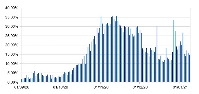 Il grafico mostra la percentuale di tamponi positivi giornalieri su tamponi giornalieri (nuove diagnosi) nel periodo 1 settembre 2020 – 8 gennaio 2021 nelle Marche