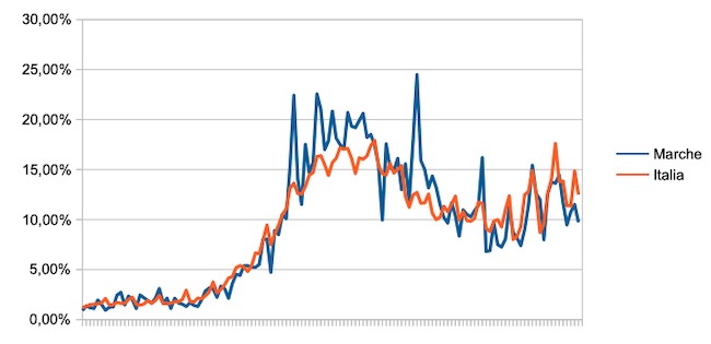 Il grafico seguente illustra l’andamento della percentuale giornaliera di nuovi casi positivi rispetto al corrispondente numero di tamponi (diagnostici +quelli di controllo) effettuati a livello nazionale e nella regione Marche nel periodo 1 settembre 2020 – 8 gennaio 2021.