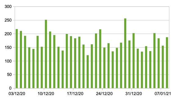 Il grafico seguente mostra i dati giornalieri ,a livello nazionale, relativi ai nuovi ingressi in terapia intensiva dal 3 dicembre 2020 al 8 gennaio 2021