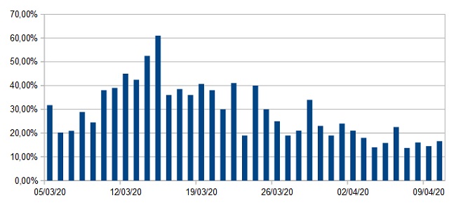 Il grafico sull’andamento dei contagi giornalieri nelle Marche nel periodo 4 marzo – 10 aprile 2020.