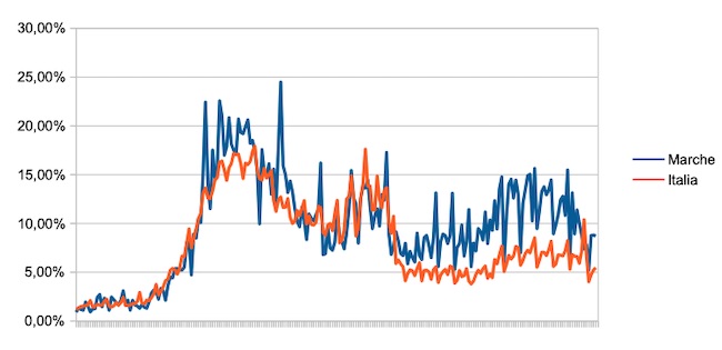 Il grafico seguente illustra l’andamento della percentuale giornaliera di nuovi casi positivi rispetto al corrispondente numero di tamponi (diagnostici +quelli di controllo) effettuati a livello nazionale e nella regione Marche nel periodo 1 settembre 2020 – 10 aprile 2021.
