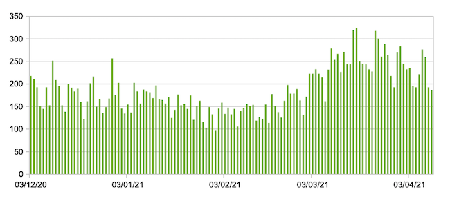 Il grafico seguente mostra i dati giornalieri relativi ai nuovi ingressi in terapia intensiva nelle Marche 3 dicembre 2020 – 10 aprile 2021.