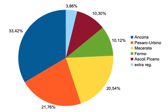 Del totale dei casi positivi 30.768 si riferiscono alla provincia di Ancona, 20.039 a quella di Pesaro-Urbino ,18.909 alla provincia di Macerata,9.322 a quella di Fermo, 9.488 a quella di Ascoli Piceno. Il servizio sanitario regionale delle Marche segue anche 3.550 casi fuori regione.