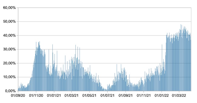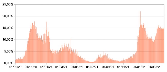 Il grafico mostra la percentuale di tamponi positivi giornalieri su tamponi giornalieri testati ( diagnostici+quelli di controllo) nel periodo 1 settembre 2020 –10 aprile 2022 in Italia.