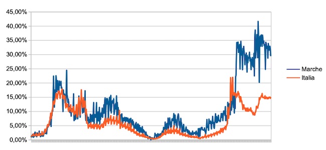 Il grafico seguente illustra l’andamento della percentuale giornaliera di nuovi casi positivi rispetto al corrispondente numero di tamponi (diagnostici +quelli di controllo) effettuati a livello nazionale e nella regione Marche nel periodo 1 settembre 2020 – 10 aprile 2022.