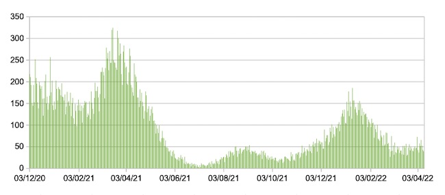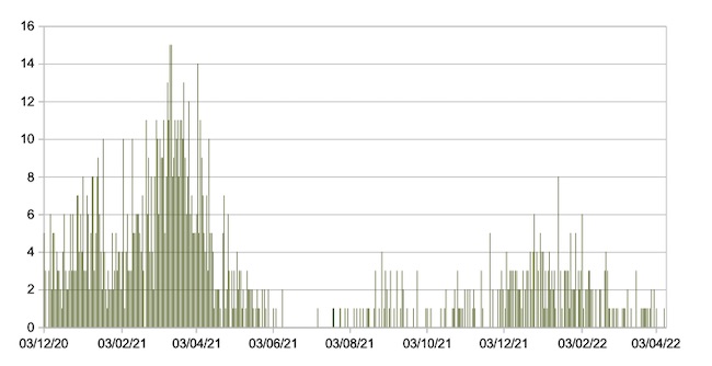 Il grafico seguente mostra i dati giornalieri relativi ai nuovi ingressi in terapia intensiva nelle Marche 3 dicembre 2020 – 10 aprile 2022.