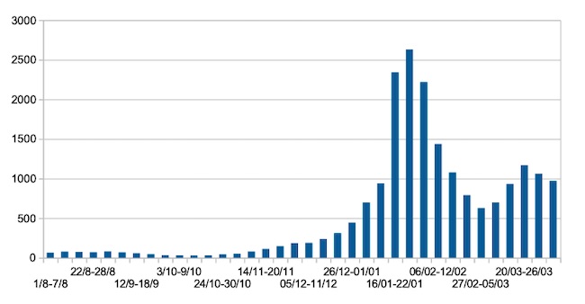 Nel grafico sono riportati i valori medi settimanali.Il valore medio della settimana 03/04/22-09/04/22 è 970,17 (la scorsa settimana era 1.061,95)