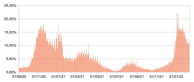 Il grafico mostra la percentuale di tamponi positivi giornalieri su tamponi giornalieri testati ( diagnostici+quelli di controllo) nel periodo 1 settembre 2020 – 10 febbraio 2022 in Italia.