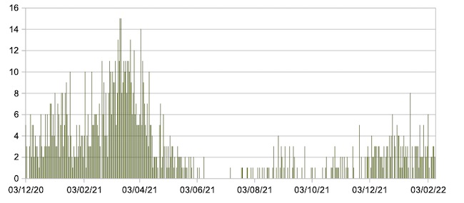Il grafico seguente mostra i dati giornalieri relativi ai nuovi ingressi in terapia intensiva nelle Marche 3 dicembre 2020 – 10 febbraio 2022.