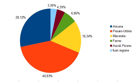 La provincia di Pesaro Urbino continua ad essere la più colpita dall’inizio del contagio; la provincia di Ascoli Piceno si dimostra invece in assoluto la meno colpita di tutta la regione Marche.