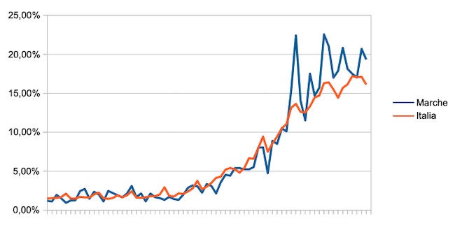 Il grafico seguente mostra l’andamento della percentuale giornaliera di nuovi casi positivi rispetto al corrispondente numero di tamponi (diagnostici +quelli di controllo) effettuati a livello nazionale e nella regione Marche nel periodo 1 settembre -10 novembre 2020.