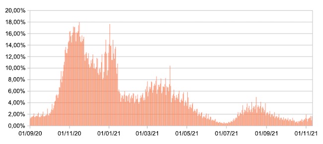 Il grafico mostra la percentuale di tamponi positivi giornalieri su tamponi giornalieri testati ( diagnostici+quelli di controllo) nel periodo 1 settembre 2020 – 10 novembre 2021 in Italia.