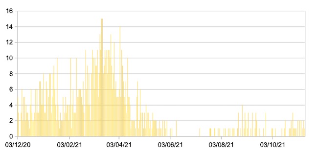 Il grafico seguente mostra i dati giornalieri relativi ai nuovi ingressi in terapia intensiva nelle Marche 3 dicembre 2020 – 10 novembre 2021.