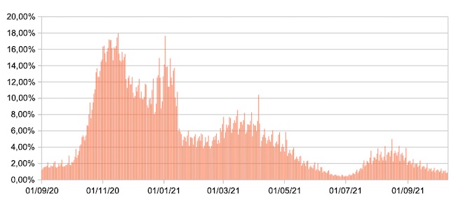 Il grafico mostra la percentuale di tamponi positivi giornalieri su tamponi giornalieri testati ( diagnostici+quelli di controllo) nel periodo 1 settembre 2020 – 10 ottobre 2021 in Italia.