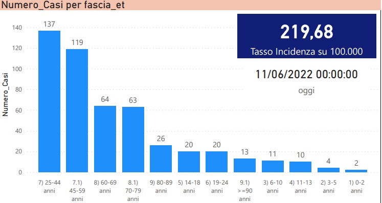 Il tasso di incidenza cumulativo su 100.000 abitanti oggi è 219,68(ieri 223,60).