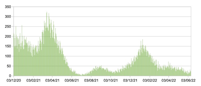 Nel grafico sono riportati i valori medi settimanali. Il valore medio della settimana 5/6/22-11/6/22 è 196,64(la scorsa settimana era 209,03).