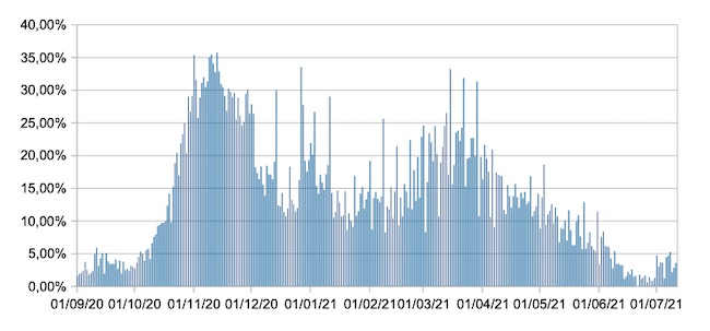 Il grafico mostra la percentuale di tamponi positivi giornalieri su tamponi giornalieri testati ( diagnostici+quelli di controllo) nel periodo 1 settembre 2020 – 11 luglio 2021 in Italia.