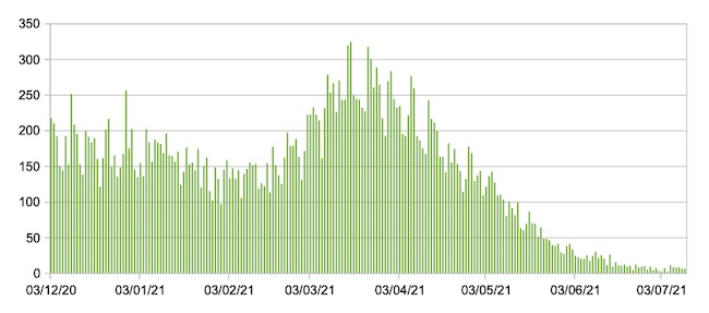 Il grafico mostra la percentuale di tamponi positivi giornalieri su tamponi giornalieri (nuove diagnosi) nel periodo 1 settembre 2020 – 11 luglio 2021 nelle Marche