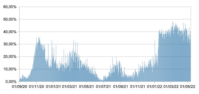Il grafico mostra la percentuale di tamponi positivi giornalieri su tamponi giornalieri testati ( diagnostici+quelli di controllo) nel periodo 1 settembre 2020 –11 maggio 2022 in Italia.