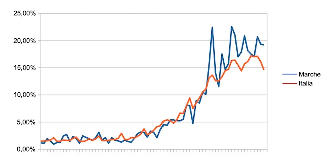 Il grafico seguente mostra l’andamento della percentuale giornaliera di nuovi casi positivi rispetto al corrispondente numero di tamponi (diagnostici +quelli di controllo) effettuati a livello nazionale e nella regione Marche nel periodo 1 settembre -11 novembre 2020.