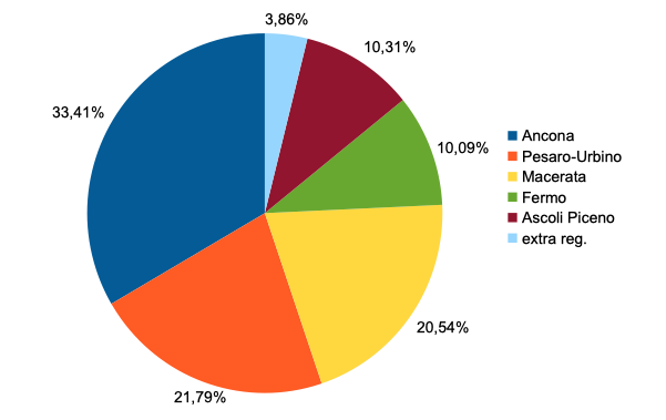 Del totale dei casi positivi 30.937 si riferiscono alla provincia di Ancona, 20.172 a quella di Pesaro-Urbino ,19.014 alla provincia di Macerata,9.343 a quella di Fermo, 9.549 a quella di Ascoli Piceno. Il servizio sanitario regionale delle Marche segue anche 3.578 casi fuori regione.