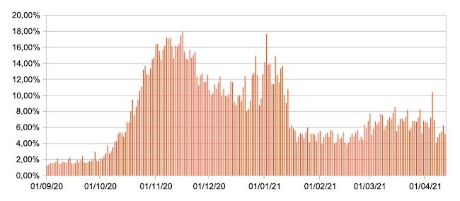 Il grafico mostra la percentuale di tamponi positivi giornalieri su tamponi giornalieri testati ( diagnostici+quelli di controllo) nel periodo 1 settembre 2020 – 12 aprile 2021 in Italia.