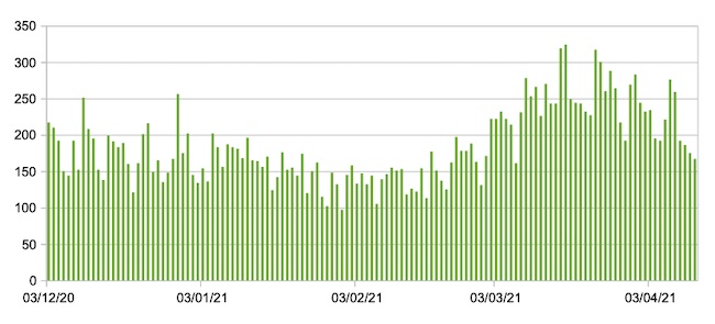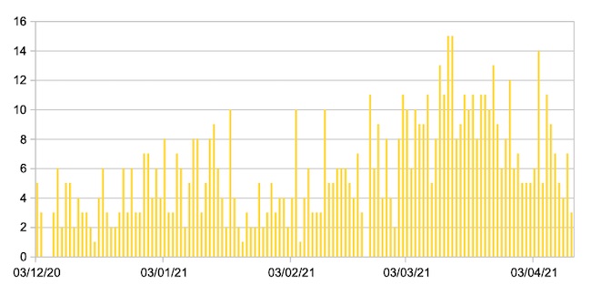 Il grafico seguente mostra i dati giornalieri relativi ai nuovi ingressi in terapia intensiva nelle Marche 3 dicembre 2020 – 12 aprile 2021.