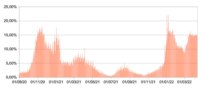 Il grafico mostra la percentuale di tamponi positivi giornalieri su tamponi giornalieri testati ( diagnostici+quelli di controllo) nel periodo 1 settembre 2020 –12 aprile 2022 in Italia.
