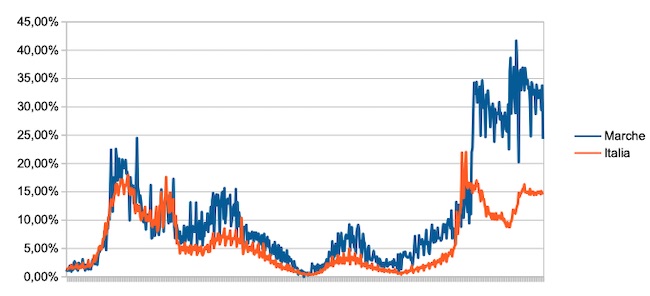 Il grafico seguente illustra l’andamento della percentuale giornaliera di nuovi casi positivi rispetto al corrispondente numero di tamponi (diagnostici +quelli di controllo) effettuati a livello nazionale e nella regione Marche nel periodo 1 settembre 2020 – 12 aprile 2022.