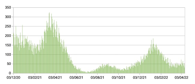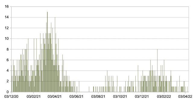 Il grafico seguente mostra i dati giornalieri relativi ai nuovi ingressi in terapia intensiva nelle Marche 3 dicembre 2020 – 12 aprile 2022.