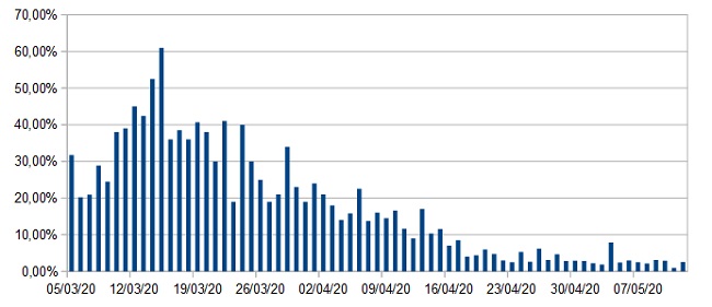 Dopo il brusco aumento dei contagi del 4 maggio per altro motivato dal fatto che tale dato relativo ai tamponi raggruppava casi del 29, del 30 aprile, dell’1 e del 2 maggio, i valori degli ultimi giorni rientrano nell’ottica del rallentamento della curva epidemiologica. Dal 18 aprile infatti gli incrementi giornalieri oscillano dall’1% al 6% segno che il contagio sta perdendo vigore. Altri segnali significativi di una tendenza positiva vengono dal numero di dimessi/guariti che cresce di giorno in giorno e dal calo di terapie intensive e nuovi ricoveri.Siamo sulla strada giusta,ma bisogna continuare a rispettare regole e restrizioni affinché si possano avere risultati sempre più confortanti.