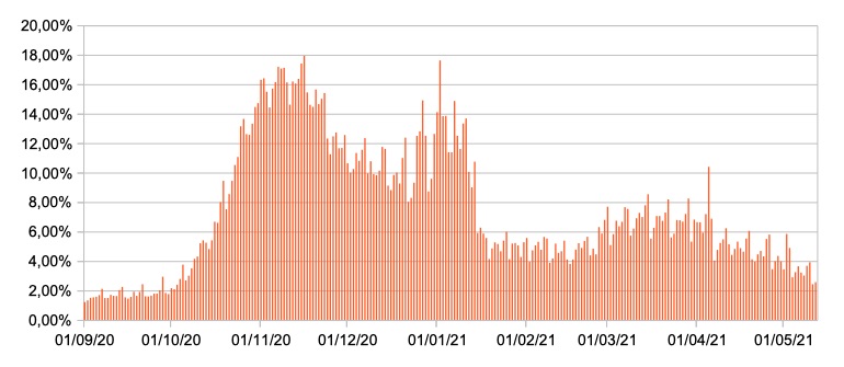 Il grafico mostra la percentuale di tamponi positivi giornalieri su tamponi giornalieri testati ( diagnostici+quelli di controllo) nel periodo 1 settembre 2020 – 12 maggio 2021 in Italia.
