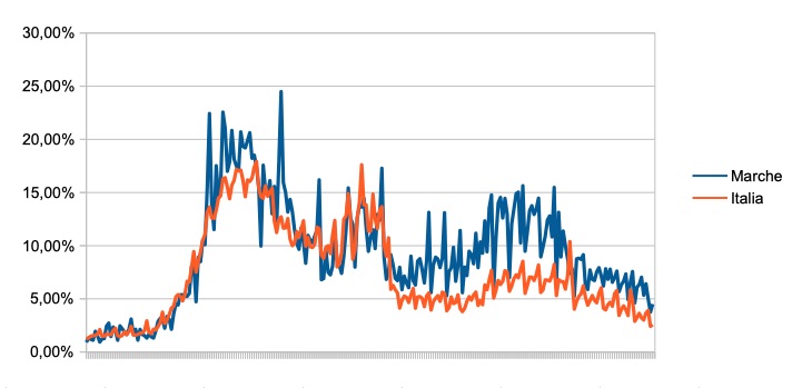 Il grafico seguente illustra l’andamento della percentuale giornaliera di nuovi casi positivi rispetto al corrispondente numero di tamponi (diagnostici +quelli di controllo) effettuati a livello nazionale e nella regione Marche nel periodo 1 settembre 2020 –12 maggio 2021.