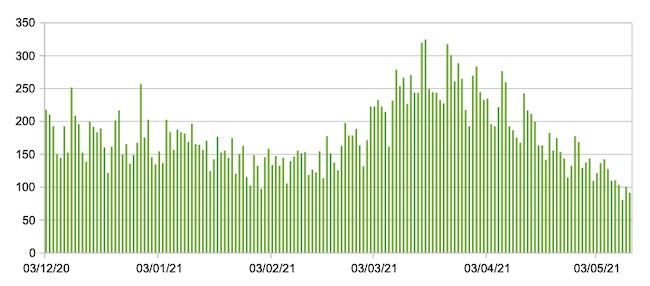 Il grafico seguente mostra i dati giornalieri ,a livello nazionale, relativi ai nuovi ingressi in terapia intensiva 3 dicembre 2020 – 12 maggio 2021