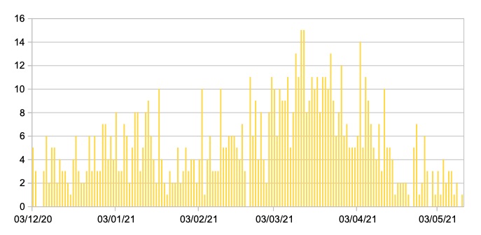 Il grafico seguente mostra i dati giornalieri relativi ai nuovi ingressi in terapia intensiva nelle Marche 3 dicembre 2020 – 12 maggio 2021.