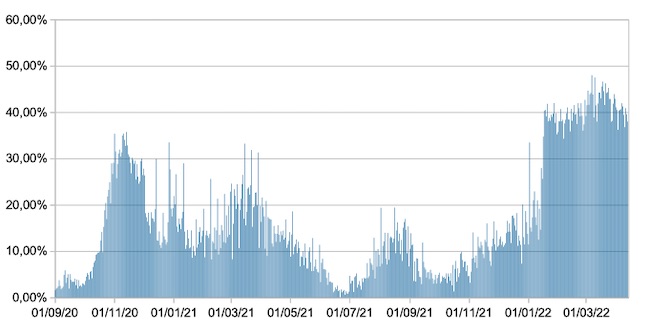 Il grafico mostra la percentuale di tamponi positivi giornalieri su tamponi giornalieri testati ( diagnostici+quelli di controllo) nel periodo 1 settembre 2020 –13 aprile 2022 in Italia.