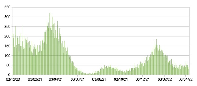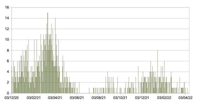 Il grafico seguente mostra i dati giornalieri relativi ai nuovi ingressi in terapia intensiva nelle Marche 3 dicembre 2020 – 13 aprile 2022.