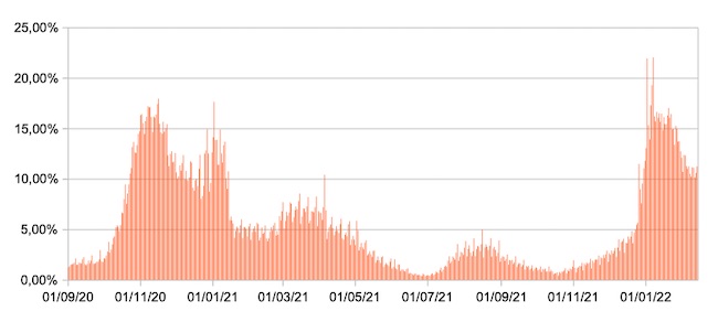 La curva è in discesa; comunque rileviamo che il valore del tasso di positività di questa ondata è più alto di quello che si registrava a febbraio 2021 (il 13/02/21 ad es.il tasso era il 4,7%,rispetto al quale quello odierno è più del doppio).